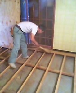 | ↑の写真は、マンションの床を遮音のフローリングにリフォーム中の写真です。 床の下地にボンドをぬって、釘を打っている作業です。 これによって、音が下に響かなくなります。 |