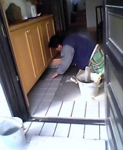 | 玄関の床をタイル張りしています。 | タイル張り作業途中。 | ||